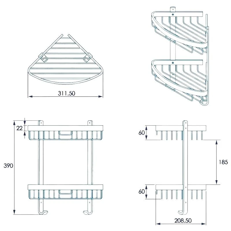 This two-tier corner basket can be easily screwed to the wall for instant shower organisation. Perfect for showers of any size, this streamlined solution makes the most of otherwise unused space. Offering two large baskets and additional storage hooks, there’s ample space for all of your daily essentials.