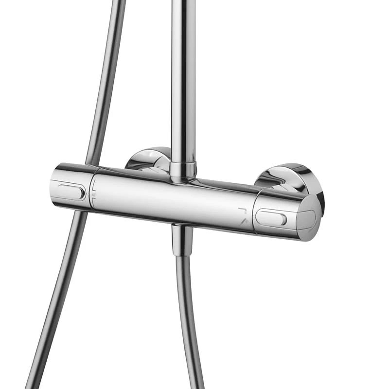 Ceratherm thermostatic exposed shower mixer with 2 outlets, Idealrain rainshower M1 with fixed riser and M3 handspray. The outlet is selected using the diverter which is integral with the flow control.